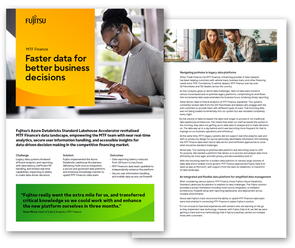 By working with Fujitsu to implement the Azure Databricks Standard Lakehouse Accelerator, MTF Finance has modernised its data landscape, enabling near real-time analytics and paving the way for continued growth in serving New Zealanders’ financing needs.