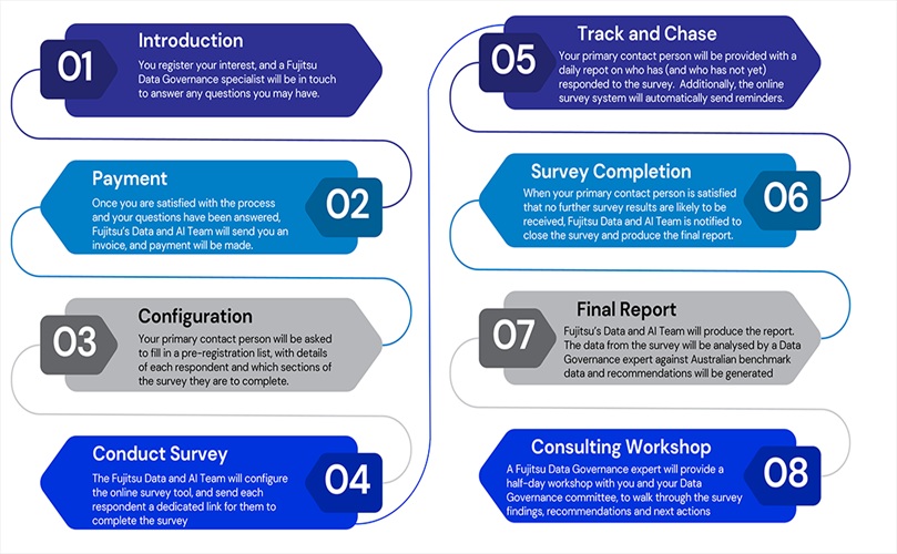 Data governance experts from Fujitsu Data & AI then review the results and provide targeted improvement recommendations in a half-day workshop where your summary results will be provided, compared against Australian benchmark data, and next step recommendations discussed.