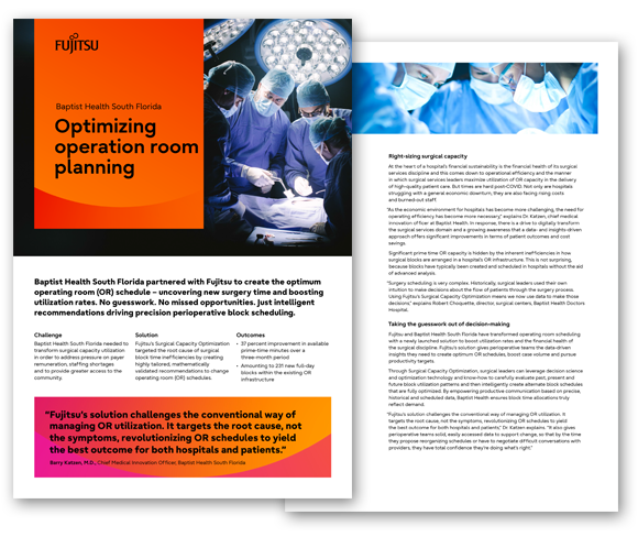 Baptist Health South Florida partnered with Fujitsu to create the optimum operating room (OR) schedule – uncovering new surgery time and boosting utilization rates. No guesswork. No missed opportunities. Just intelligent recommendations driving precision perioperative block scheduling.