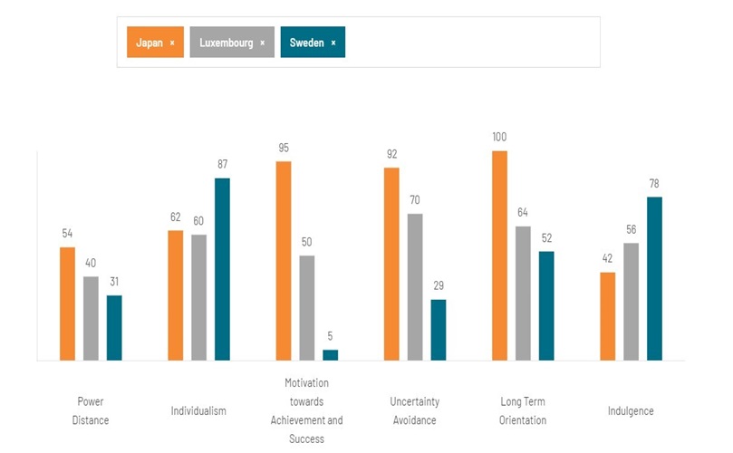 This ties into Hofstede’s cultural model (2), a widely used UX method that helps comparing the key tendencies between countries. For example, if we compare Japan and Luxembourg using this cultural model, we can see that uncertainty avoidance is higher in Japan. The difference is even more obvious, when compared to a Northwestern country like Sweden.
