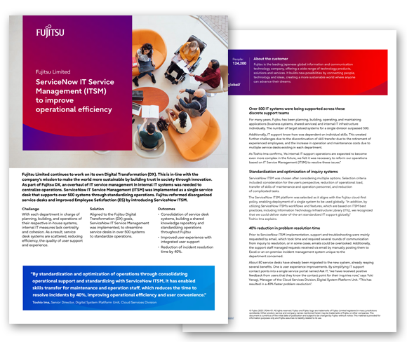 Fujitsu Limited continues to work on its own Digital Transformation (DX). This is in-line with the company’s mission to make the world more sustainable by building trust in society through innovation. As part of Fujitsu DX, an overhaul of IT service management in internal IT systems was needed to centralize operations. ServiceNow IT Service Management (ITSM) was implemented as a single service desk that supports over 500 systems through standardizing operations. Fujitsu reformed disorganized service desks and improved Employee Satisfaction (ES) by introducing ServiceNow ITSM.