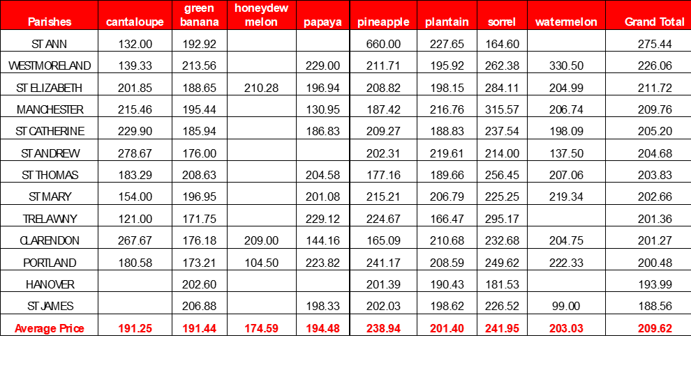 On the other hand the most expensive produce are found within the parishes of Manchester, St. Ann and Westmoreland with an average price of $217 JMD, $216 JMD and $215 JMD per KG/ lb respectively. The top 5 most expensive products these three parishes including their average prices are green banana ($201.44 JMD), cantaloupe ($208.68 JMD), pineapple ($211.41 JMD), watermelon ($214.24 JMD) and plantain ($216.29 JMD).