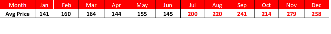 The total average price for green banana over all three years accumulates to $194 JMD per KG, based on these prices it is acceptable to take the position that green banana prices in excess of $194 JMD is expensive and the prices below that amount are more affordable. The month over month average data for green banana suggest that purchasing green banana between January and June would be most economical for brick and mortar businesses and consumers.