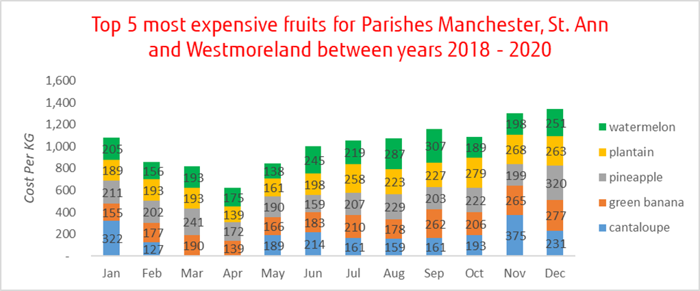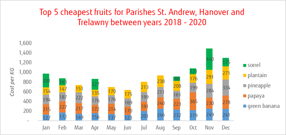 The results for most and least expensive implies that some fruits are expensive and affordable in certain parishes at specific times of the year. One such fruit for example is green banana which is typically sold at a lower price for the first half of the year.