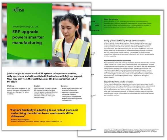 Fujitsu partnered closely with Johoku to implement Microsoft Dynamics 365 Business Central (D365BC) via a cloud-based subscription model. The engagement included a comprehensive Fit/Gap analysis, data migration, user training, and post-deployment support. Fujitsu deployed core modules for Sales, Supply Chain, Inventory, and Manufacturing, along with customizations such as barcode integration, forecast usage, and tailored reporting. “Fujitsu’s flexibility in adapting to our rollout plans and customizing the solution to our needs made all the difference,” said Natcharin Rojcharoenpanya Business Management Group & HR Assistant Manager at Johoku Thailand.