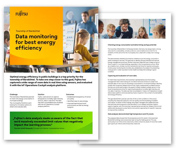 To meet these requirements, the township‘s representatives and the building management team went looking for innovative technical solutions to obtain and evaluate data on the room air and energy consumption in municipal buildings. Working closely with its partner, Dataport.Kommunal, Fujitsu implemented a suitable solution. During a six-month pilot project, the experts initially installed multiple sensors in the local comprehensive school for capturing temperature, humidity, light intensity, and C02 data in real time. The data was then consolidated in Fujitsu‘s IoT Operations Cockpit data analysis platform and evaluated by Fujitsu‘s experts in the context of sustainability and energy efficiency.