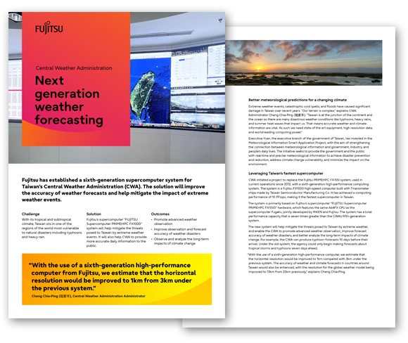 Fujitsu’s supercomputer “FUJITSU Supercomputer PRIMEHPC FX1000” system will help mitigate the threats posed to Taiwan by extreme weather events. It will also help CWA to provide more accurate daily information to the public.