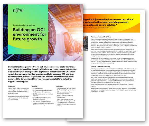 Daikin’s largely on-premise Oracle EBS environment was costly to manage and created technical bottlenecks when internal resources were stretched. It selected Fujitsu to migrate this digital core infrastructure to OCI which now delivers an cost-effective, scalable, and fully managed ERP platform to underpin the business. Fujitsu has also enabled disaster recovery and deployed the ServiceNow IT Service Management platform to further support the company.