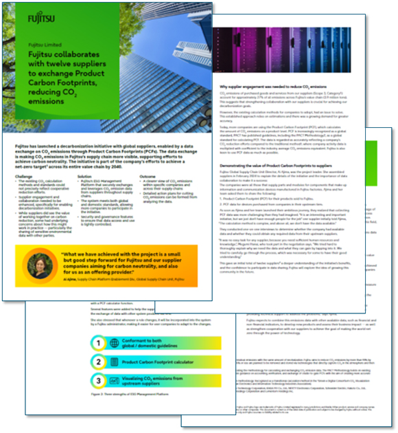 - Fujitsu’s ESG Management Platform that securely exchanges and leverages CO2 emission data from suppliers throughout supply chains.