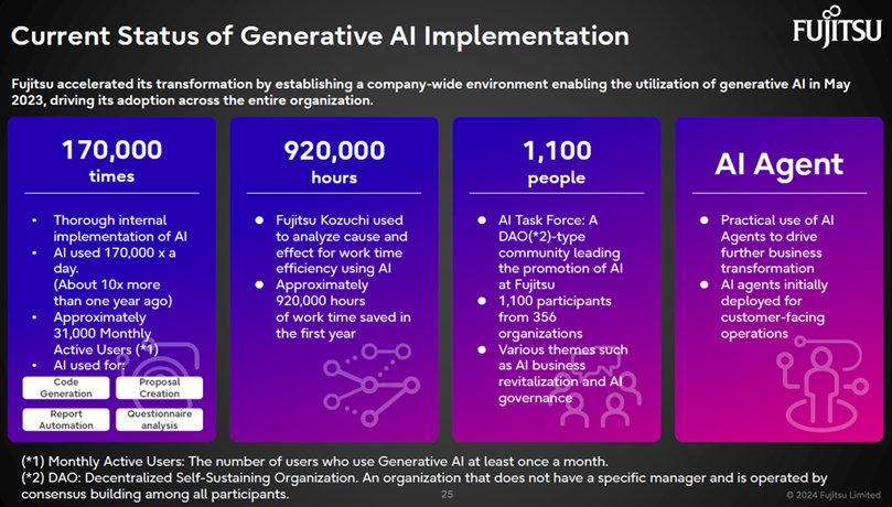 Fujitsu established a company-wide environment enabling the use of generative AI in May 2023. Now, about a year and a half later, approximately 35,000 employees are using generative AI for tasks such as code generation, proposal creation, report automation, and questionnaire analysis, with approximately 170,000 uses per day. Fukuda stated, "The number of uses has increased about tenfold compared to a year ago. The use of generative AI has become established in internal operations."