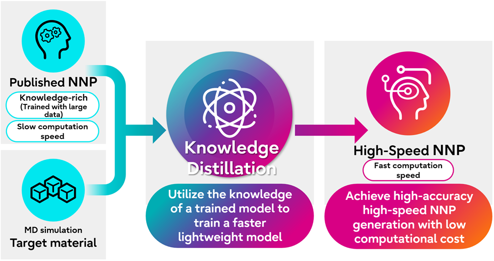 Fujitsu developed a knowledge distillation technique (Figure 1) to precisely train NNPs with a faster multi-layer perceptron (MLP) [7] architecture. This is achieved by transferring knowledge from computationally slower, but knowledge-rich, GNN-based published NNPs. This approach allows MLP-based NNPs to leverage extensive published NNP knowledge and specialized material structure insights, enabling stable, high-speed, long-duration MD simulations for large-scale systems exceeding 100,000 atoms.