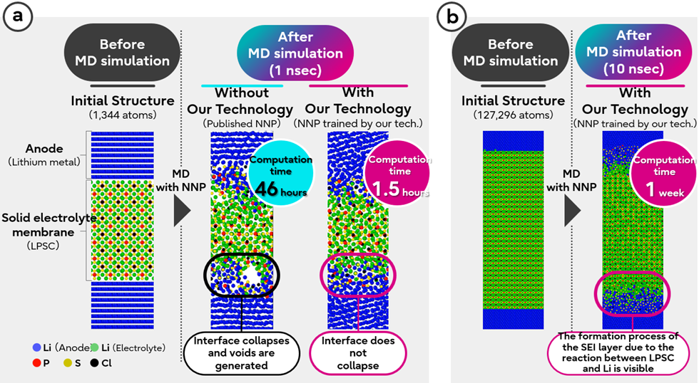 Fujitsu today announced the successful development of a technology for molecular dynamics (MD) simulation that enables atomic-level structural analysis of the solid electrolyte interphase (SEI) [1] formation process in all-solid-state batteries. This process, previously difficult to analyze, significantly impacts battery performance. Fujitsu achieved this breakthrough by developing a neural network potential (NNP) [2] training method using knowledge distillation [3], enabling stable, long-duration MD simulations. The newly developed technology can now rapidly and accurately reproduce the behavior of all-solid-state battery electrolyte membrane and electrode interface structures [4] with over 100,000 atoms for 10 nanoseconds, requiring only one week of computation.