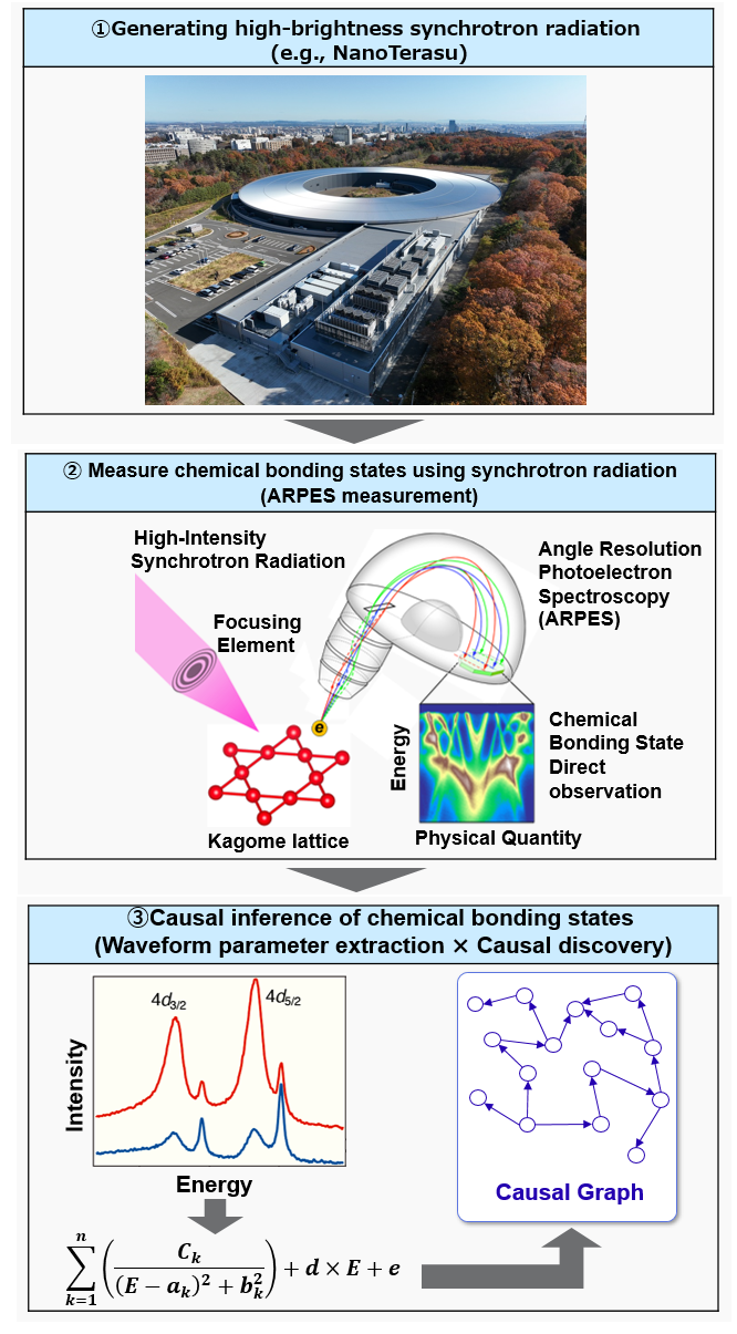 ARPES measurement data is very large. A causal graph of the data has a massive number of nodes making it difficult to find useful information. The technique developed in this collaboration significantly compresses the scale of the causal graph by performing fitting based on a model equation for the measurement data and constructing a causal graph from only the extracted parameters. In addition, the two parties developed a technique to further simplify the graphs and reduce noise impact. This technology reduced the size of the causal graph to less than 1/20 of the conventional size, enabling the efficient discovery of new insights.