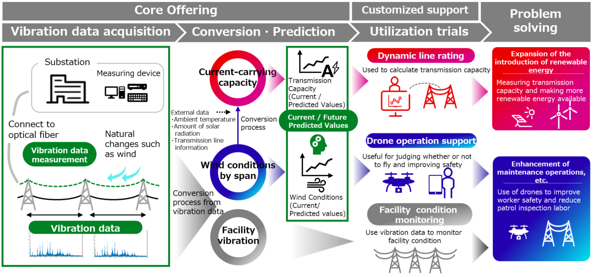 In addition, the data obtained from the basic functions can be utilized to support power transmission and distribution companies in addressing various operational challenges. It supports the operational design and system construction for dynamic line rating technology, thereby reducing renewable energy curtailment and promoting efficient power utilization. Furthermore, wind condition data around transmission lines can guide drone flight feasibility and optimal route selection. By assessing facility conditions from vibration data, the service also facilitates labor-saving and advanced maintenance operations, moving beyond traditional on-site and human-dependent methods.