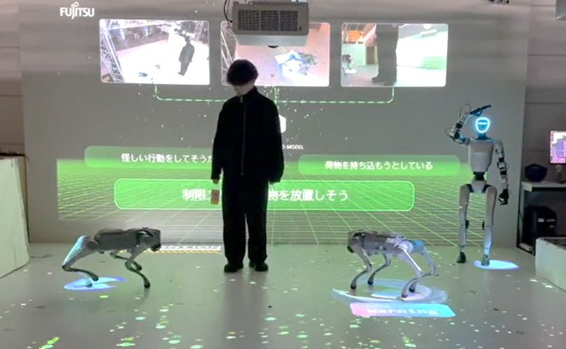 This photo is a demonstration of our "Spatial World Model". It integrates cameras placed in an environment, with cameras mounted on robots – enabling us to imagine the future of the entire space, predicting a person's actions and intentions to enter a restricted area. Unlike conventional technology that detects events after they occur, its key feature is the ability preemptively to coordinate multiple robots based on the predicted future. For more details, please refer to the following content (*1)(*2)(*3).