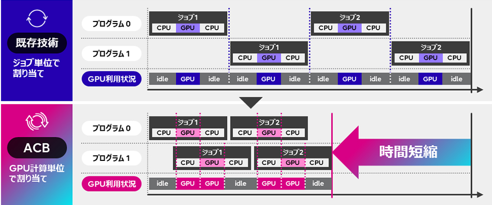 Godai: Existing technologies allocate GPUs on a per-job basis, where a job is a unit of work executed by a program. For example, Job 1 and Job 2 of Program 0, and Job 1 and Job 2 of Program 1 each use the GPU sequentially. This creates idle time for the GPU (e.g., during pre- and post-processing that don't utilize the GPU, or while waiting for input from other systems or users), resulting in low GPU utilization. In contrast, the AI computing broker allocates the resources at the GPU computation level. By assigning GPUs to Program 0 and Program 1 based on GPU availability, it improves GPU utilization and reduces overall processing time. This technology delves into the program's processing details and allocates GPUs only to the processes that actually require them, enabling significantly more efficient GPU resource allocation and maximizing GPU usage.