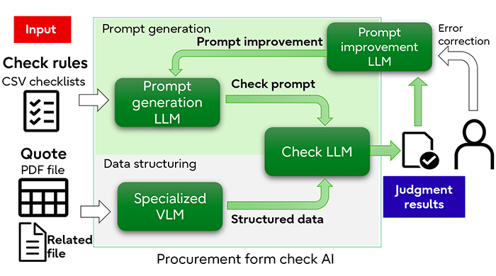 Firstly, forms such as quotations often have diverse formats from company to company, as well as often containing complex descriptions, which makes it difficult to structure the data accurately. Secondly, when leveraging AI, engineers are required to generate prompts tailored to the unique rules of each company and business operation, which incurs significant costs. To address these challenges, we have developed a new approach - procurement form check AI. This technology contributes to preventing erroneous orders and reduces the need for multiple manual checks.