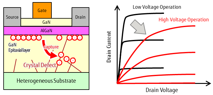 With conventional GaN-HEMT power amplifiers, the semiconductor crystal layer (GaN epitaxial layer) is generally formed on a heterogeneous substrate, such as silicon carbide (SiC) or silicon (Si). The issue is that GaN epitaxial layers on heterogeneous substrates contain a large number of crystal defects. These defects trap electrons traveling in the GaN epitaxial layer during a power amplifier’s high voltage operation, which causes a deterioration of current in the HEMT (Fig. 1). As a result, the output power and the power conversion efficiency of the GaN power amplifier are degraded.