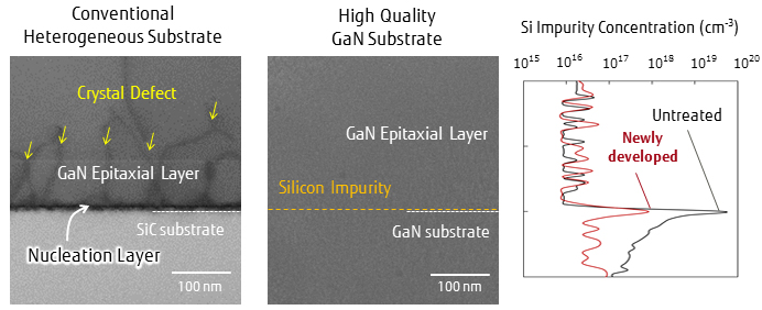 To address this challenge, we focused on developing GaN-HEMTs with a higher efficiency than conventional transistors, by not only using a high-quality GaN substrate but also applying a treatment to the GaN substrate surface before the crystal epitaxial grows.