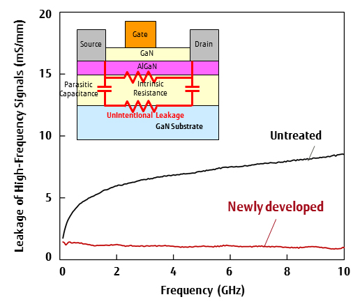 Our technique is designed to improve the efficiency of GaN-HEMTs by deactivating the Si impurities. We achieve this by lowering the concentration of Si compared to the concentration of iron (Fe) added to inactivate the GaN substrate (2-9x10¹⁸ cm⁻³), and applying a special treatment to the surface of the GaN substrate before epitaxial growth. As shown in Fig. 3, in a conventional GaN-HEMT power amplifier without any surface treatment of the GaN substrate, the leakage of high-frequency signals increases as the frequency rises from 1 GHz to 10 GHz. However, by applying our new technique, the leakage of high-frequency signals can be suppressed regardless of the frequency.