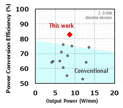 Evaluating the output characteristics at 2.45 GHz of the newly developed GaN-HEMT power amplifier, we were able to demonstrate 82.8% efficiency performance, which is currently the world's highest efficiency in the 2-3 GHz band (Fig. 4).