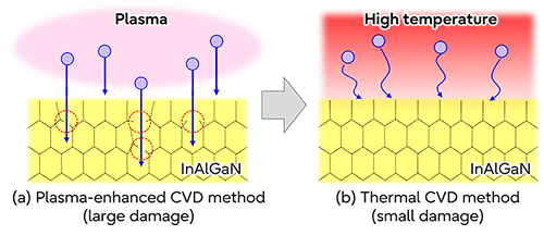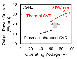 In this study, we applied silicon nitride (SiN) formed by a method called thermal chemical vapor deposition (CVD), in which thin films are deposited by thermal decomposition products or chemical reactions, as a protective film on the surface of a semiconductor. Compared to the widely used plasma-enhanced CVD method, the thermal CVD method does not use a plasma containing a large amount of charged particles, which can cause the underlying material to deteriorate. Therefore, the degradation of the semiconductor surface can be greatly suppressed (Fig. 2). By applying the SiN film formed by the thermal CVD method to the InAlGaN-based HEMT, we were able to achieve both a further increase in the current value, a decrease in the electron trap caused by the current collapse, and an increase in the breakdown voltage. As a result, we successfully obtained a power density of 31 W/mm at an operating voltage as high as 90 V as an X-band power amplifier (Fig. 3 and 4).