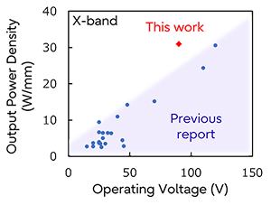 This has been realized by improving the quality of the insulating protective film used in high electron mobility transistors (HEMTs) based on gallium nitride (GaN) material. GaN-HEMTs feature a wide bandgap and a robust structure, and are used for power amplifiers in the frequency range of X-band, which is widely used in wireless communications and radar. The result is a world-leading power density of 31 W/mm (watts per millimeter*). This is the highest value** for solid-state electron devices including GaN materials, and the first update to the top data in nearly 20 years.