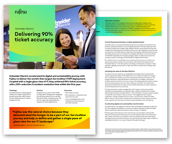 Schneider Electric accelerated its digital and sustainability journey with Fujitsu to deliver the world’s then largest ServiceNow ITOM deployment. Coupled with a single glass view of IT, they achieved 90% ticket accuracy, with a 50% reduction in incident resolution time within the first year.