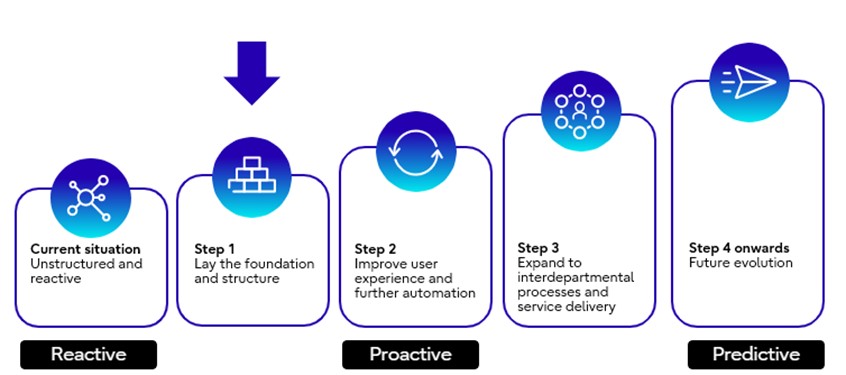 With your vision and roadmap in place, the journey begins, and unsurprisingly, you need to start with the basics. The image below shows a maturity model that helps you make the first steps: