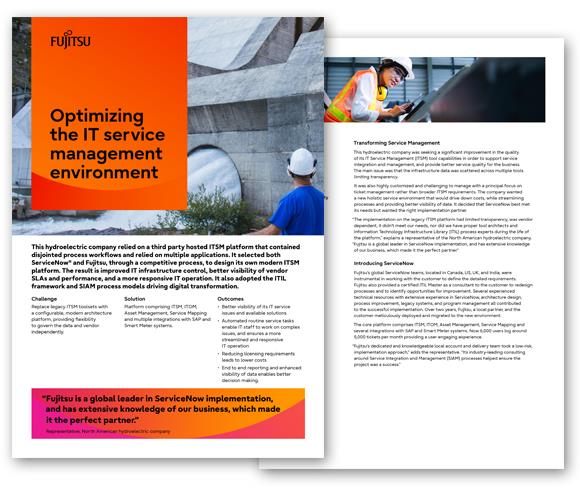 “The implementation on the legacy ITSM platform had limited transparency, was vendor dependent, it didn’t meet our needs, nor did we have proper tool architects and Information Technology Infrastructure Library (ITIL) process experts during the life of the platform,” explains a representative of the North American hydroelectric company. “Fujitsu is a global leader in ServiceNow implementation, and has extensive knowledge of our business, which made it the perfect partner.