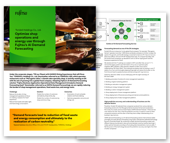 Under the corporate slogan, “Fill our Planet with KANDO Dining Experiences that will Move You.” TORIDOLL Holdings Co., Ltd. (hereinafter referred to as TORIDOLL HD), which operates restaurants such as “Marugame Udon,” a Sanuki udon specialty shop, is actively working on DX with the aim of growing into a global food company. Adopting Fujitsu’s AI Demand Forecasting solution “Fujitsu Business Application Operational Data Management & Analytics Demand Forecasting SaaS” (hereinafter referred to as ODMA Demand Forecasting), we are rapidly reducing the burden of shop management operations, food waste loss, and energy costs.