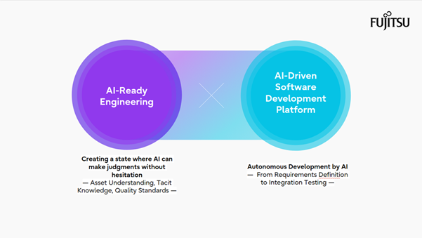 Fujitsu näkee tekoälypohjaisessa ohjelmistokehityksessä keskeisenä AI-Ready Engineering -lähestymistavan, jossa käytettävät resurssit valmistellaan niin, että tekoäly ymmärtää järjestelmät oikein. Tämä mahdollistaa erittäin luotettavan automaation. Tekoälyavusteinen ohjelmistokehitys nopeutuu, kun AI-Ready Engineering ja AI-Driven Software Development Platform toimivat yhdessä.