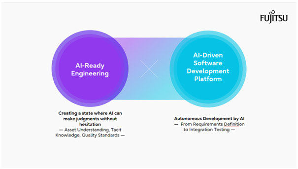 Dans le cadre du développement piloté par l’IA, Fujitsu considère l’« AI-Ready Engineering » — processus consistant à préparer les actifs et les connaissances afin de garantir que l’IA comprenne correctement les systèmes existants et permette une automatisation hautement fiable — comme un élément clé. En combinant AI-Ready Engineering et la plateforme de développement pilotée par l’IA, Fujitsu accélérera le développement logiciel assisté par l’IA.