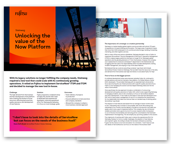 With so many offices and various subsidiaries, Steinweg decided to rely on Fujitsu to implement ServiceNow IT Service Management (ITSM) and IT Operations Management (ITOM) to replace legacy platforms that were no longer fit for Steinweg’s global operations and the growing demand on IT from the business. However, the company soon realized that its small and centralized IT department in the Netherlands was struggling with the scale of its responsibilities which included development, testing, incident management, and staying on top of the latest features.
