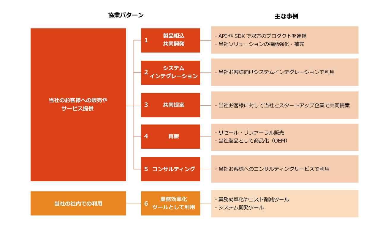 当社が指定した分野を中心とした事業提携を目的としております。協業テーマや協業パターンの例については、こちらをご参照ください。