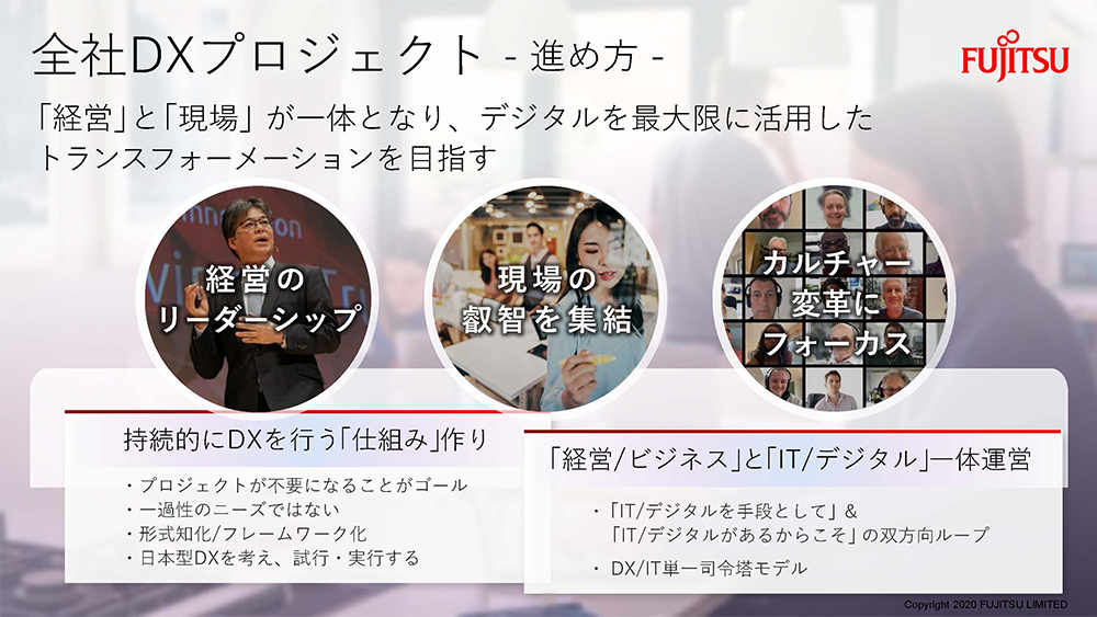 この1年の大きな変化と言えば、やはりリモートワーク/働き方でしょう。富士通には数年前からリモートワークの制度自体は既にあったのです。ただ十分に活用されていたとは言い難い。従来はどうしても用事があって参加できない人がリモートでも参加できる、というのが実態でした。今ではすっかり逆になり、課題はもちろんありますが、今まで通りグローバルで13万人が粛々と業務を遂行しています。