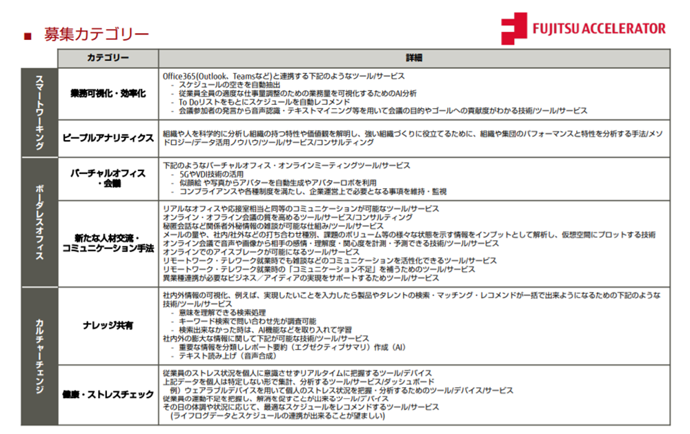 そんな中「富士通アクセラレーター for Work Life Shift」が始まります。「フジトラ」とも連携するとのことで、応募する立場としてはフジトラの守備範囲が気になります。