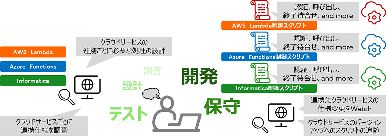 これらのポイントに対する必要手順やAPI仕様はクラウドごとに異なるため、個別に制御スクリプトを作り込む必要があります。また、DXを進める中で新しいクラウドの追加やAPI仕様の変更が発生するたびに、API仕様の調査、制御スクリプトの開発・保守といった作業が必要となります。