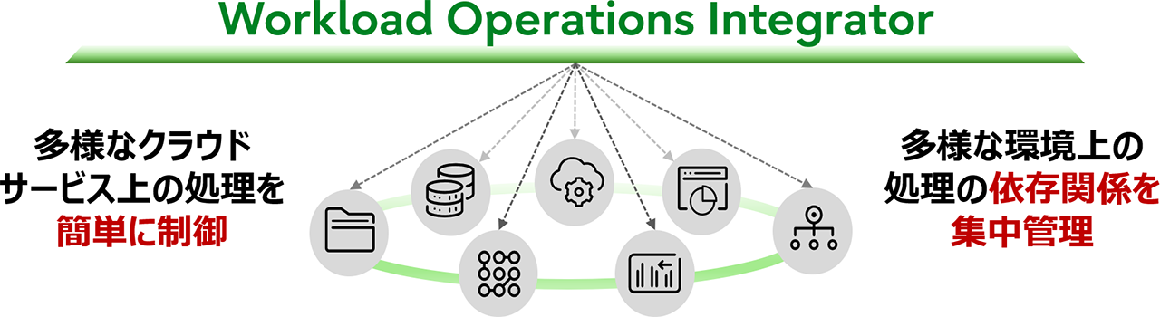 Workload Operations Integrator は、制御に必要な処理の共通化や処理の関係性の一元管理を実現するSaaS型のオーケストレーションサービスとして、複数のサービス・システム間の連携処理を制御・管理します。