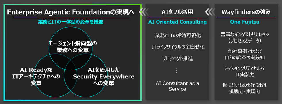 従来の個社・業務ごとのSIでは、複雑化する経営課題を解決することが難しくなっているなか、お客さま自身がデータとAIを駆使し、経営や事業、業務を自律的かつ継続的に進化させることが肝要です。そのためには、データとAIを最大限に活用するためのビジネスの枠組みである、Enterprise Agentic Foundation(エンタープライズ・エージェンティック・ファウンデーション)の構築が不可欠です。当社は、豊富なインダストリーの知見、IT実装力、先端テクノロジー、当社自身を変革する全社DXプロジェクトで得た実践知などの強みをベースに、業務プロセスの可視化やITライフサイクルの全自動化など、AIを徹底活用した支援を行います。具体的には、エージェント指向型の業務への変革や、お客さまのIT環境の刷新、そしてあらゆる業務へのセキュリティの埋め込みを主軸に、お客さまがデータとAIを最大限活用できるようビジネス環境を再整備し、自律指向型のEnterprise Agentic Foundationを実現します。