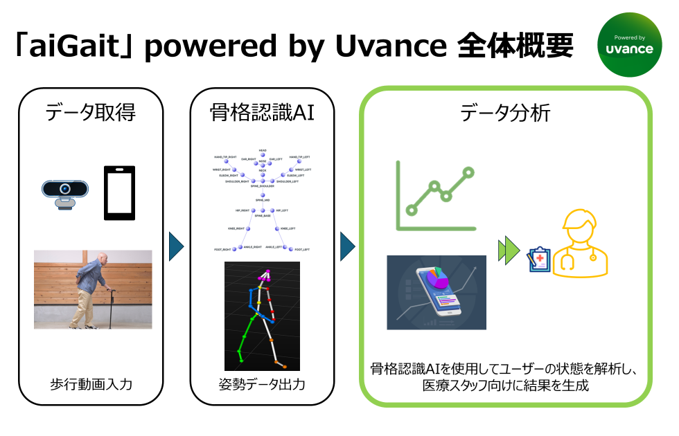 台湾の医療機関に併設される高齢者向けデイケアセンターなどにおいて、介護者や看護師がスマートフォンやタブレットを用いて、対象者の歩行や椅子から立つ、座るなどの簡単な動作を撮影し、「Fujitsu Uvance」の「AI Technologies and Solutions」を搭載したAcer Medicalのアプリケーション「aiGait」powered by Uvanceで簡易分析を行います。この分析は病気の兆候を早期に把握するためのスクリーニング手段であり、看護師や介護士は自動生成されるレポートを確認し、対象者の動作が予め設定した正常な範囲から逸脱している場合は、医師による診察受診を促し病気の早期発見につなげます。
