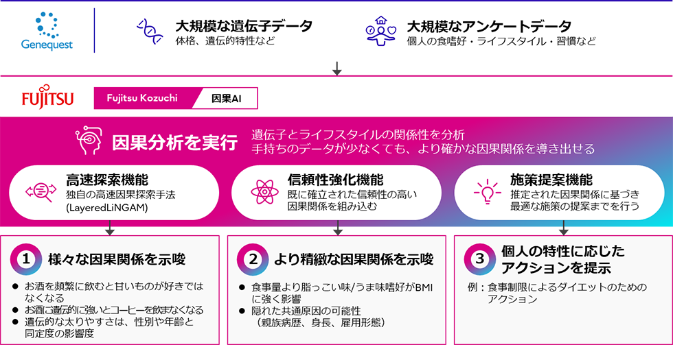 株式会社ジーンクエスト(注1)(以下、ジーンクエスト)と富士通株式会社(注2)(以下、富士通)は、富士通のAIサービス「Fujitsu Kozuchi」のコア技術である因果AIを活用し、遺伝子とライフスタイルの関係性に新たな知見を得ること(以下、本研究)に成功しました。