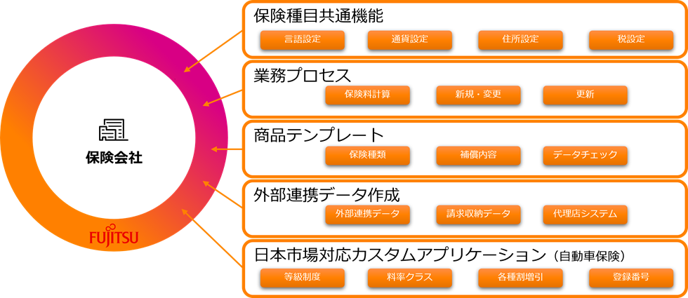 そこで当社は、上記の課題を解決するため、保険業界の基幹業務を網羅したSAP Fioneerの「SAP Fioneer Cloud for Insurance」をベースに、日本市場特有の業務プロセスや法規制などに対応した機能やテンプレート、外部とのデータ連携機能などを独自開発し拡充した「Fujitsu Cloud for Insurance Japan Edition」を開発しました。第一弾として、保険種目に関わらず使用する言語設定などの共通機能・業務プロセスや、代理店型保険およびネット型保険のいずれにもニーズの高い自動車保険向けの機能を中心としたプラットフォームの提供を開始します。