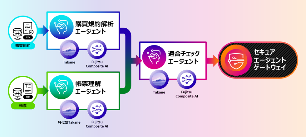 「Takane」をベースとした「Fujitsu Kozuchi AI Agent」として、帳票理解・購買規約解析・適合チェックにそれぞれ特化させた3種類のAIエージェントを開発し、企業購買部門における調達業務のワークフローの自動化を可能にしました。帳票理解の特化型AIエージェントは、マルチヘッダなどを含む複雑な帳票の構造を理解し、高い精度で帳票を構造化データに変換します。購買規約解析の特化型AIエージェントは、購買規約を解析しチェック用プロンプトを生成します。適合チェックの特化型AIエージェントは、この構造化された帳票データとチェック用プロンプトにより、規約の適合チェックを自動で行います。適合チェックされた見積依頼は、セキュアエージェントゲートウェイを介して機密情報などが記載されていないかを確認し、社外の発注先へと送信されます。