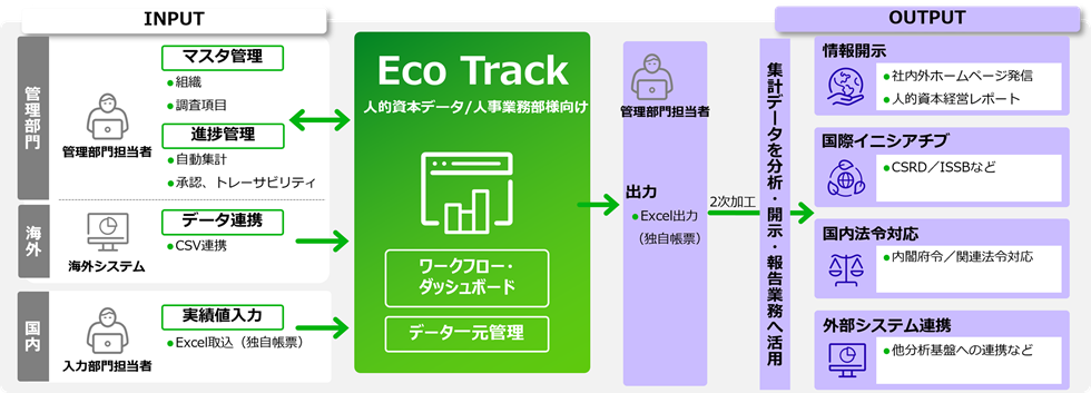 「Eco Track」は企業のサステナビリティ経営に必要となる、人的資本情報やその他非財務情報などの多種多様なデータの収集から集計、開示までをトータルに支援するSaaS型のサービスです。