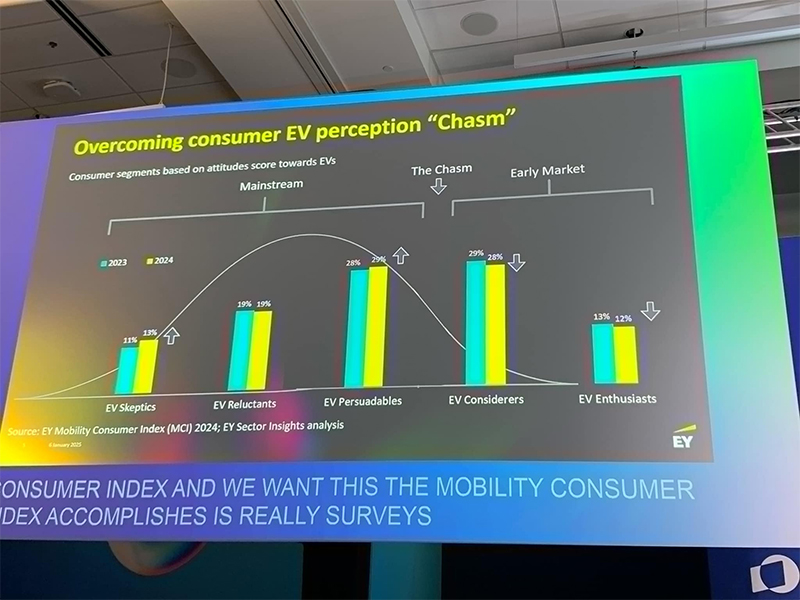 EV市場は、米国や西欧ではキャズム理論が指摘する「キャズム(断絶)」に直面しているという指摘もなされた。キャズム理論とは、新しいテクノロジーやプロダクトが普及する際、初期の熱心な採用者から、より保守的な多数派へと広がる過程で、大きな断絶(キャズム)に直面するというものだ。このキャズムを超えるには、一般消費者が求める具体的な実用性や信頼性を確立し、テクノロジーやプロダクトの価値を広く認知させることが不可欠とされる。