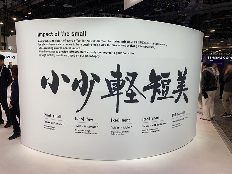 「Impact of the Small」は、スズキが築き上げてきたものづくりの理念「小・少・軽・短・美(Sho-Sho-Kei-Tan-Bi)」に根ざしている。この理念は、「小さく(small)、シンプルに(few)、軽く(light)、スピーディーに(short)開発し、その調和は必然に美しいもの(beautiful)になる」という考え方を反映。これにより、スズキは環境負荷を抑えながらも、効率性、機能性、デザイン性のすべてを兼ね備えた製品づくりを実現するという。
