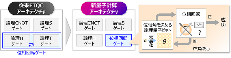 大阪大学と富士通は、Tゲートに代わる位相回転ゲートを新たに定義して導入することで、従来の1/10以下の量子ビット数で、任意回転の実行に掛かるゲート操作回数を従来の約1/20程度に低減することができ、物理量子ビットでの量子エラー確率の約1/8まで抑えて、非常に高精度な計算を可能にします。