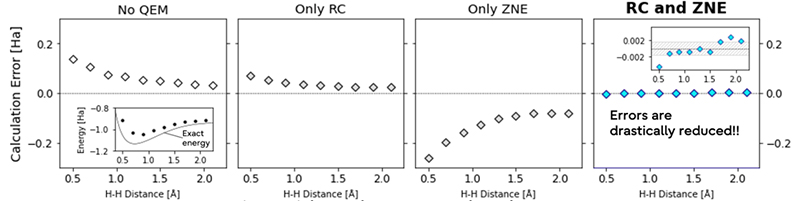 ここでは量子化学のためのVQE*1; H2の基底状態エネルギーの計算に対し、Randomized CompilingとZero-Noise Extrapolationを組み合わせることで、過回転ノイズ下のエラー率を劇的に低減させた事例をご紹介します[5]。