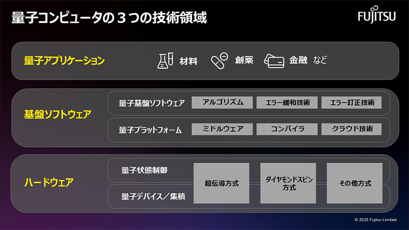 - ハードウェア : 量子コンピュータ本体と、その制御技術(量子デバイスや集積技術、量子状態制御技術など)